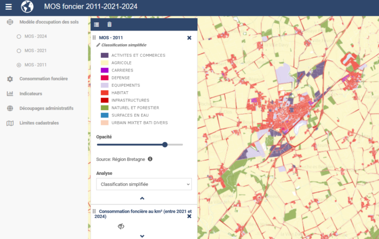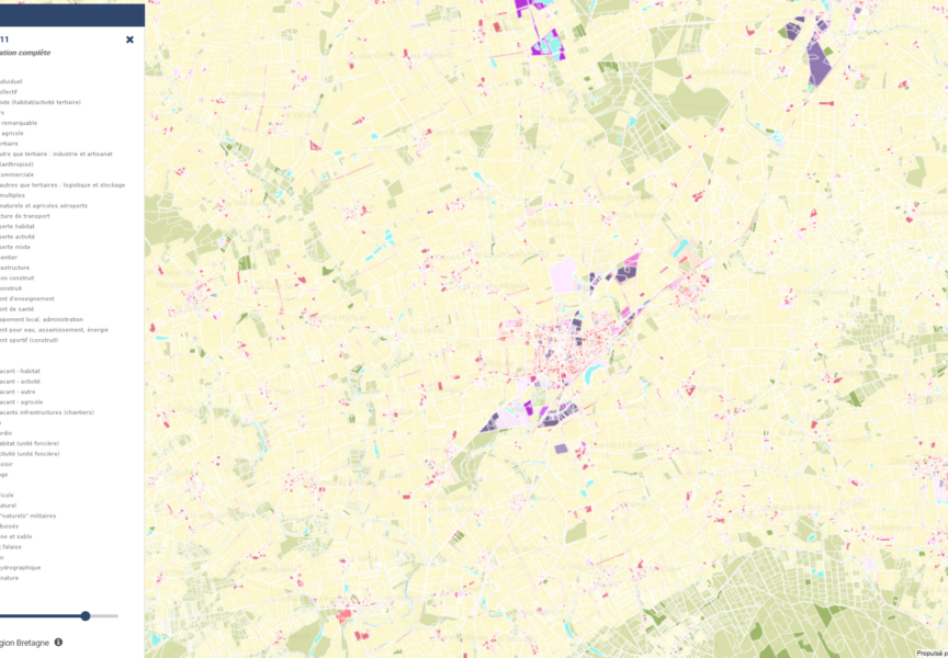En Bretagne, le suivi de la consommation d’espace à amené la Région et les territoires de SCoT (Schéma de Cohérence Territoriale) à se doter d’un nouvel outil – le MOS (Mode d’Occupation des Sols)* – pour avoir une base de lecture commune et affinée des différents usages fonciers > habitat, activités, équipements, espaces naturels, etc. Les données, visibles par tranches de 10 années, sont aussi régulièrement mises à jour pour pouvoir bénéficier d’une photographie intermédiaire, cf. résultats 2011-2021 et 2021-2024 sur l’ensemble du parcellaire breton :